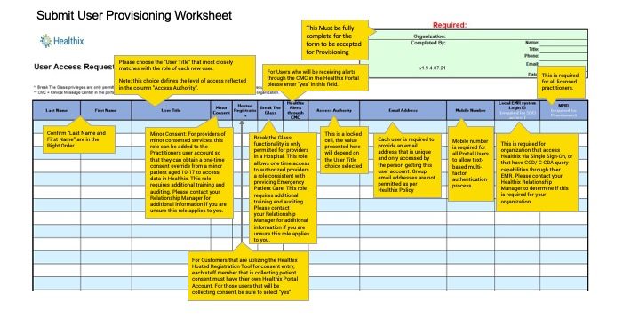 On this provisioning form, list the names, contact information and emails of your staff who will need Healthix access. Please confirm the current title/position of these employees and their required level of access. By completing this sheet, you are attesting that all information provided is true and the access level is deemed appropriate for the employees listed.